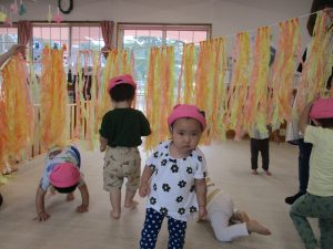 しかし室内でも、氷遊びをしたり、布玩具を使ってプールを作ってみたりと、夏らしい遊びを満喫することができたつぼみ組さんです(^^♪