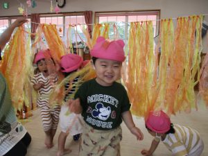 布の玩具を長く繋げてホースに見立て、みんなで消火活動開始です(^^)!!