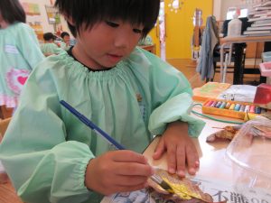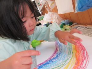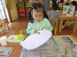 カブトムシが好きなお友達は、足の形や体の色を思い出しながら描いたり、虹を作りたいお友達は折り紙をちぎったり