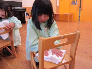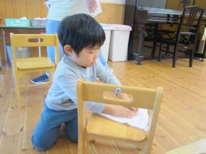 椅子やロッカー、おもちゃなどを拭きました!自分の担当の場所を一生懸命に拭く子どもたち!!