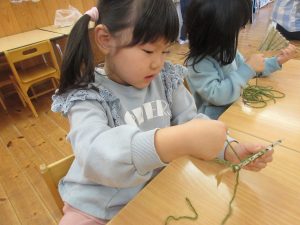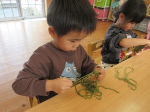 三角の土台に毛糸を上手にグルグル巻いたり、ペタペタ貼ったりして、キラキラのシールやモール、リボンで飾り付けをしましいた!