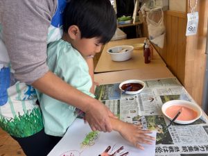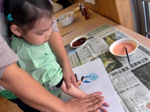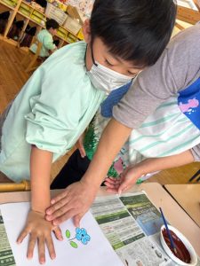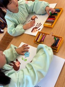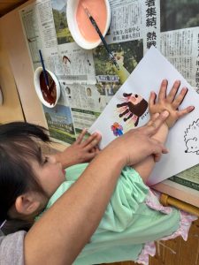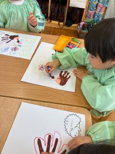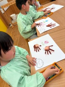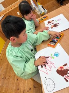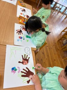 手形にハリネズミの顔を描いたり、周りに太陽や花・草などイメージしたものをくっきりと描くことができていました✨
