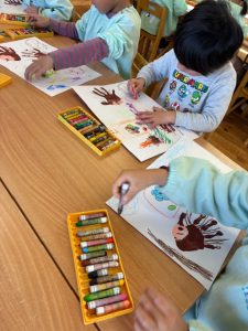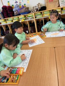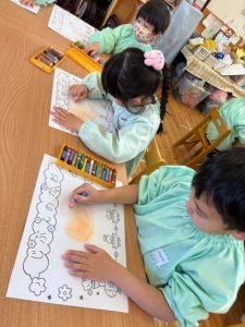 鏡で自分の髪の色や目の色をよく見てから描く子もいたり、顔の形はどんな形か自分の顔を触って確認したりする様子が見られていました✨