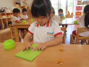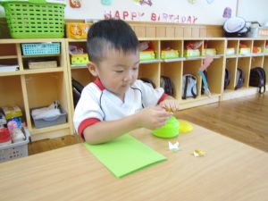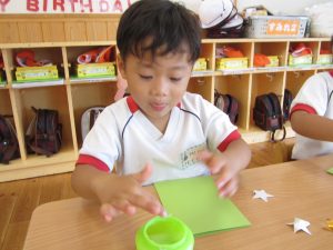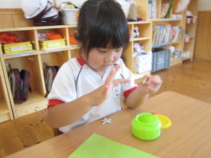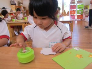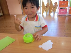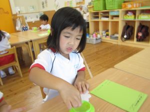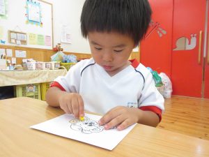 のりを指先ですくう量も分かってきた子どもたちは、「お豆ってこのくらいかな?」「もっと多くつけなきゃ!」と考えながら取り組んでいました☺