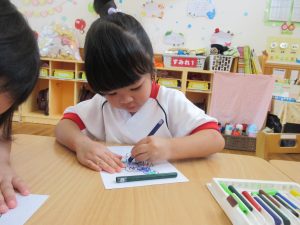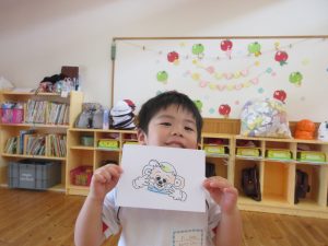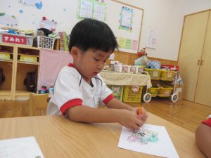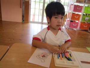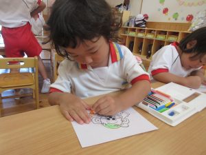 ホワイトボードに貼ってある、ウェイキーの画像をよく見ながらそっくりに塗っていたり、好きな色を使って塗ったりする姿が見られました♪