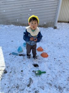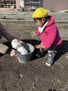 スコップや砂場セットのお皿を使って雪集めをしたり、保育者が作った雪だるまと「こんにちは☺」をしたりして会話を楽しむ姿も発見しました✨夕方には溶けてなくなっていることに気づき、「雪ないね~」とお話をして教えてくれました。