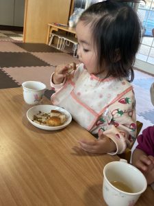 エプロンを自分で身に着けようと頑張る子や、「いただきます👐」の挨拶を上手にする子、
