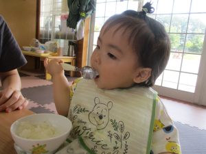 今までは食べさせてもらうのを待っていることが多かったのですが、最近では自分達でスプーンやフォークを使い、食べようとする姿が見られます。口の前でスプーンがひっくり返り、こぼれてしまうことは日常茶飯事!!笑
