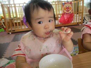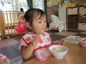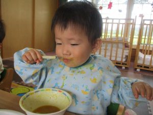 今までは食べさせてもらうのを待っていることが多かったのですが、最近では自分達でスプーンやフォークを使い、食べようとする姿が見られます。口の前でスプーンがひっくり返り、こぼれてしまうことは日常茶飯事!!笑