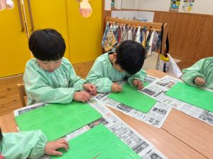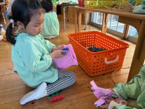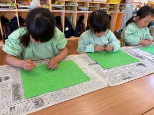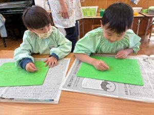 粘土板の型抜きの部分にくっついた粘土をつまようじで丁寧に取っていた子ども達☺️「アンパンマンのほっぺの部分にたくさん粘土がくっついてる!」「うさぎさんのお顔綺麗になったよ!」など真剣な表情で綺麗にしていた子ども達でした♡