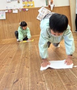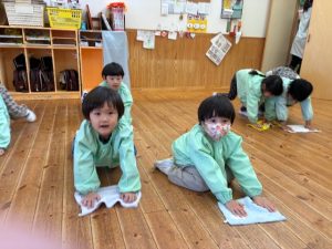 雑巾掛けでは発表会の時の曲に合わせて、床がピカピカになるように何度も雑巾で拭いてくれていました!お掃除の時間もあったことで、みんな雑巾掛けの職人さんとなり、隅々まで綺麗に拭くことができていました✨