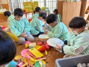 絵の具の実験では赤・青・黄の絵の具を混ぜて様々な色があることを発見したり、スライム遊びでは小さく違ってお米にしたり、黄色と白を混ぜて卵焼きを作ったりなど、自分たちで考えたことを形やもので表現することを楽しんでいました☺️そこから、お友達との会話も増え、役割を分担しながら遊びや活動をすすめたり、困っている子に駆け寄ったりと気持ちの折り合いをつけながら取り組む姿・思いやる姿をたくさん見ることができました✨そんな優しくて面白いことが大好きなひまわりさんからいつもパワーをもらっていました💪